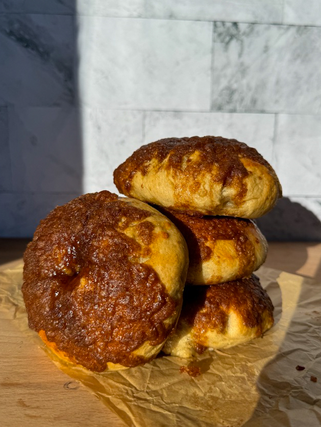 - Brush bagels with egg wash and then top with cinnamon crunch mixture.