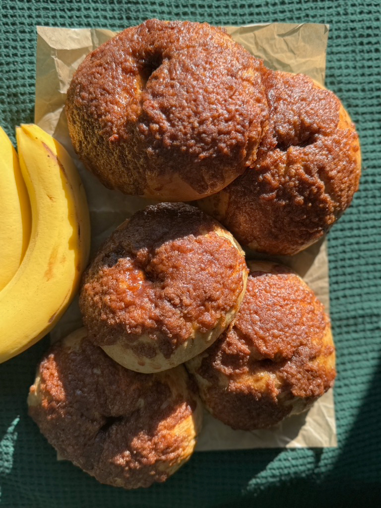 These banana bread bagels are filled with all the flavors of banana bread and topped with a cinnamon crunch topping. Making these bagels perfect for a bakery at home experience.