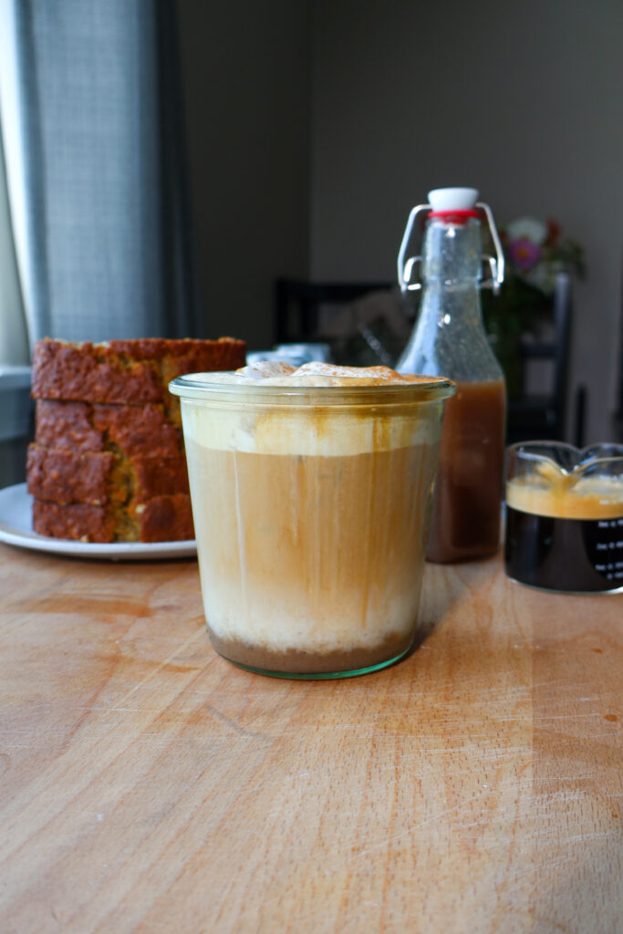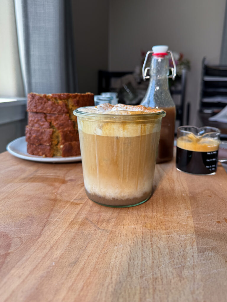 In a large glass filled with ice, add banana bread syrup, milk, and freshly brewed espresso. Top with the maple cold foam and enjoy your sippable slice of banana bread!