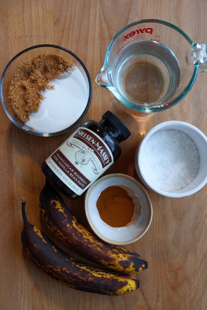 Blend ripe bananas with water until smooth. Pour into a saucepan and add both sugars and cinnamon. Bring to a gentle boil, then simmer for 10–15 minutes until thickened and aromatic. Stir in the vanilla and salt. Let cool and store in an airtight container in the fridge for up to 2–3 weeks.
