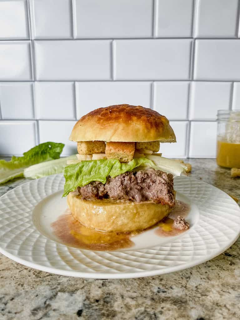 - Build your burger with the bottom bun, caesar dressing, cooked patty, lettuce, more caesar dressing, croutons, and top bun.