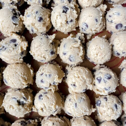 I also love how easy this dough is to throw together! It takes less than 15 minutes and you have perfectly edible cookie dough to enjoy! I always scoop it up like I would cookies, pop it in the freezer for an hour and transfer to a ziplock bag. Then I have a sweet treat available whenever I want, I do have to warn you though the bag doesn’t last nearly as long as you would hope!