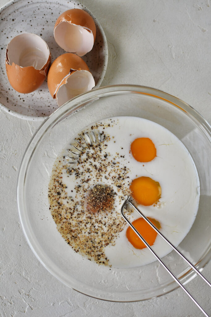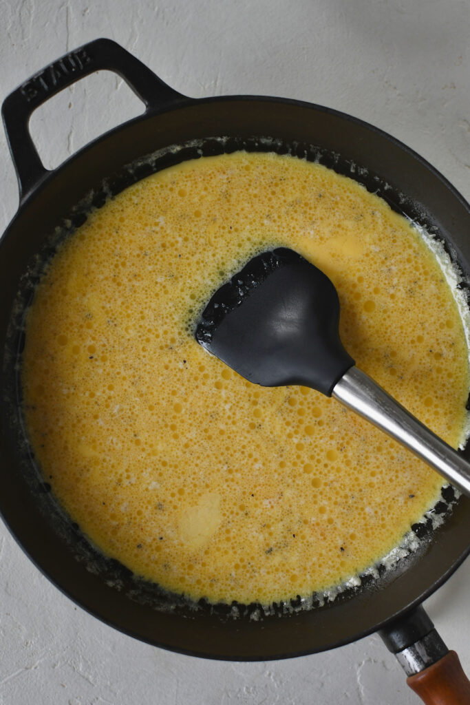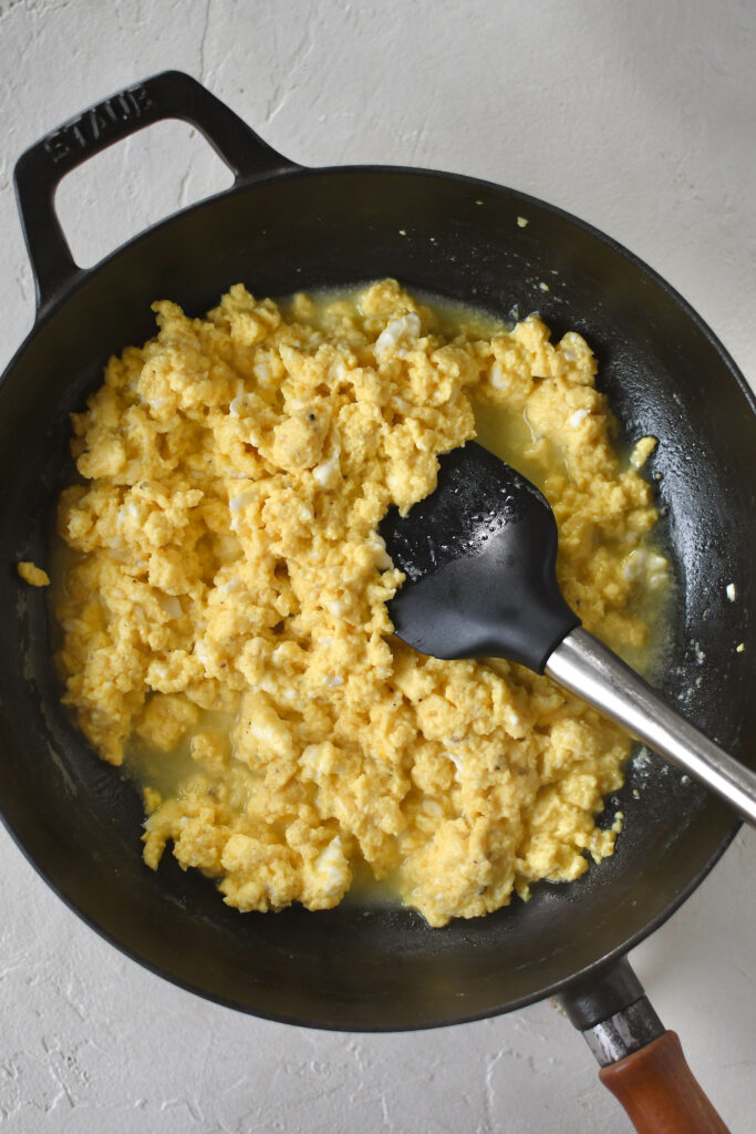 - Milk – mixed with the eggs for a light and fluffy scramble.