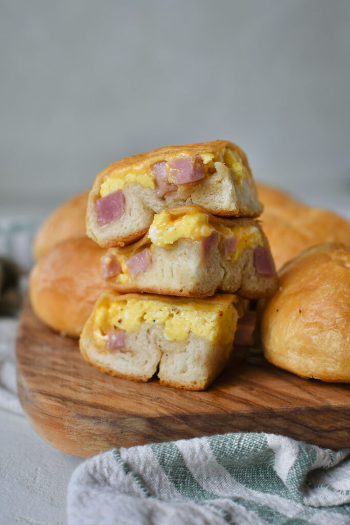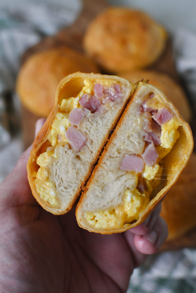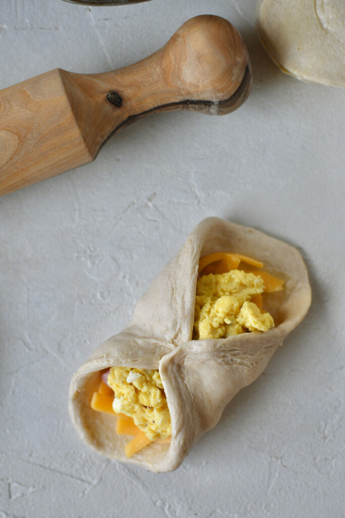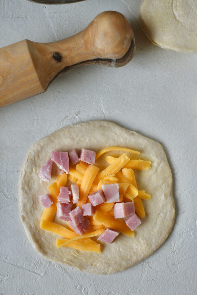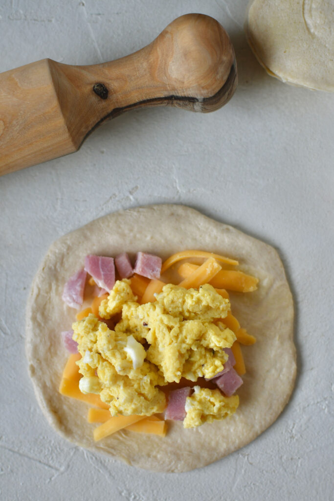 - Roll the biscuits into a small circle, then fill with cheese, ham, and eggs.