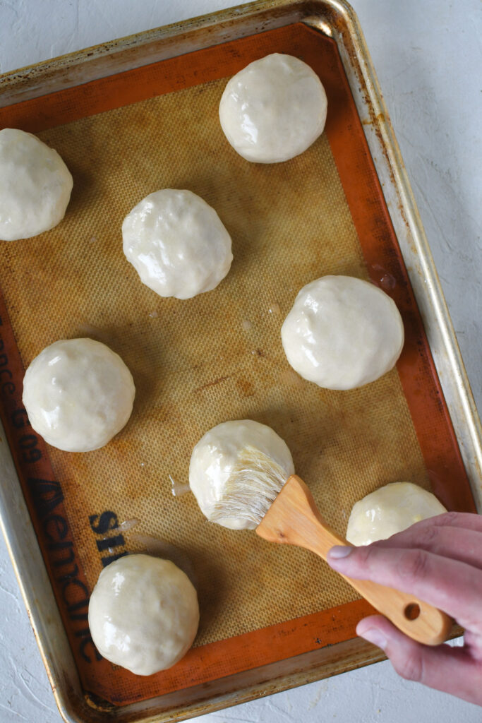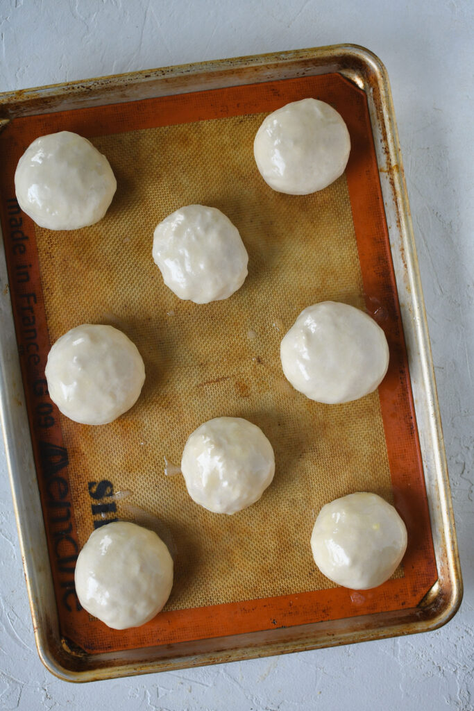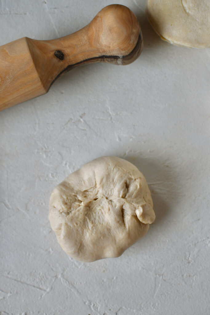 - Pinch up to middle to seal and place seam side down on a baking sheet.