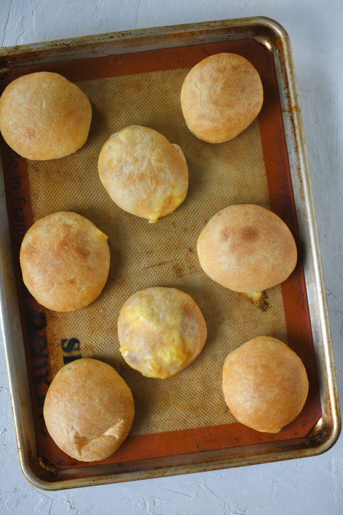 - Roll the biscuits into a small circle, then fill with cheese, ham, and eggs. Pinch up to middle to seal and place seam side down on a baking sheet. Brush with melted butter.