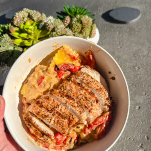 - Prepare the Chicken – While peppers roast, cut chicken into bite-sized pieces, season lightly, and sauté in a skillet until golden and cooked through. Remove and set aside.
