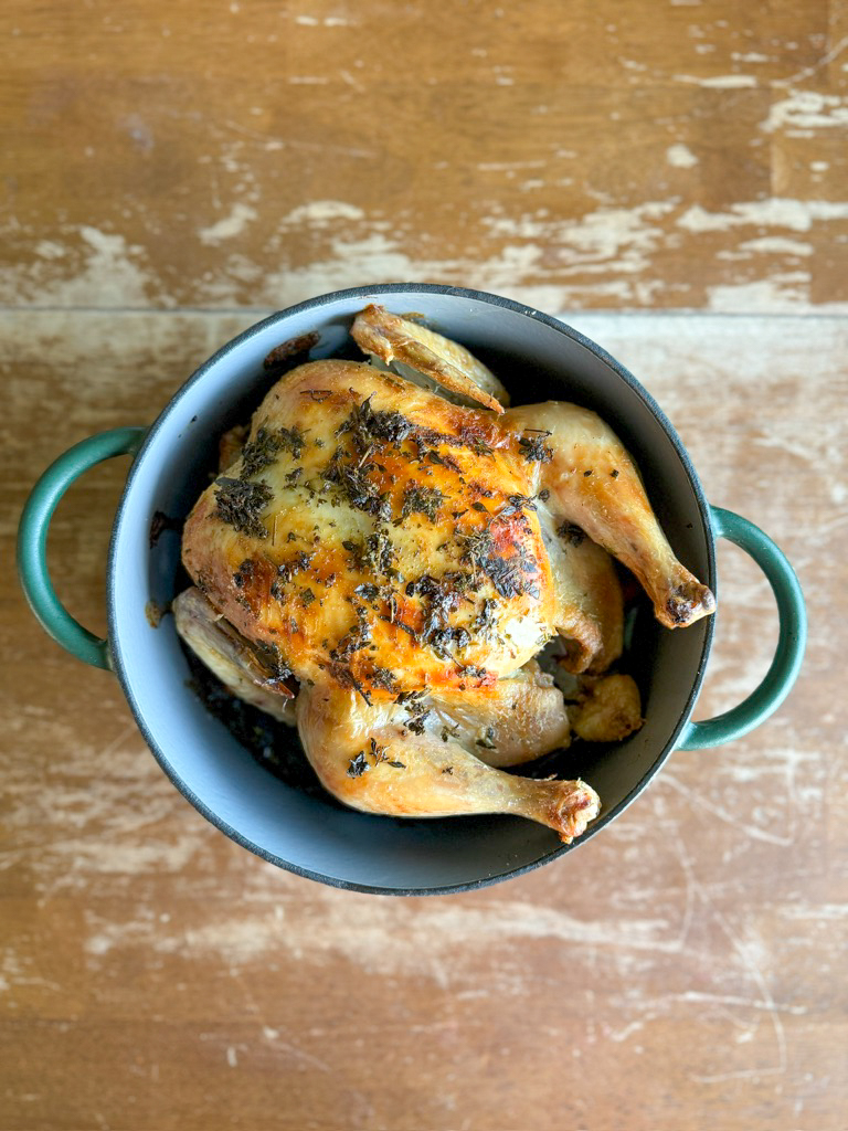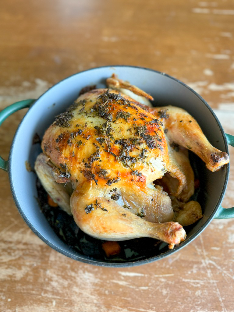 There’s nothing more comforting than the smell of a whole roasted chicken filling the kitchen. It’s one of those timeless meals that feels just as right on a Sunday evening with family as it does when you’re hosting guests. This Super Simple whole roasted chicken recipe is made in a dutch oven and is one of my go-tos because it’s simple, foolproof, and results in the juiciest chicken with perfectly crisp skin every single time.