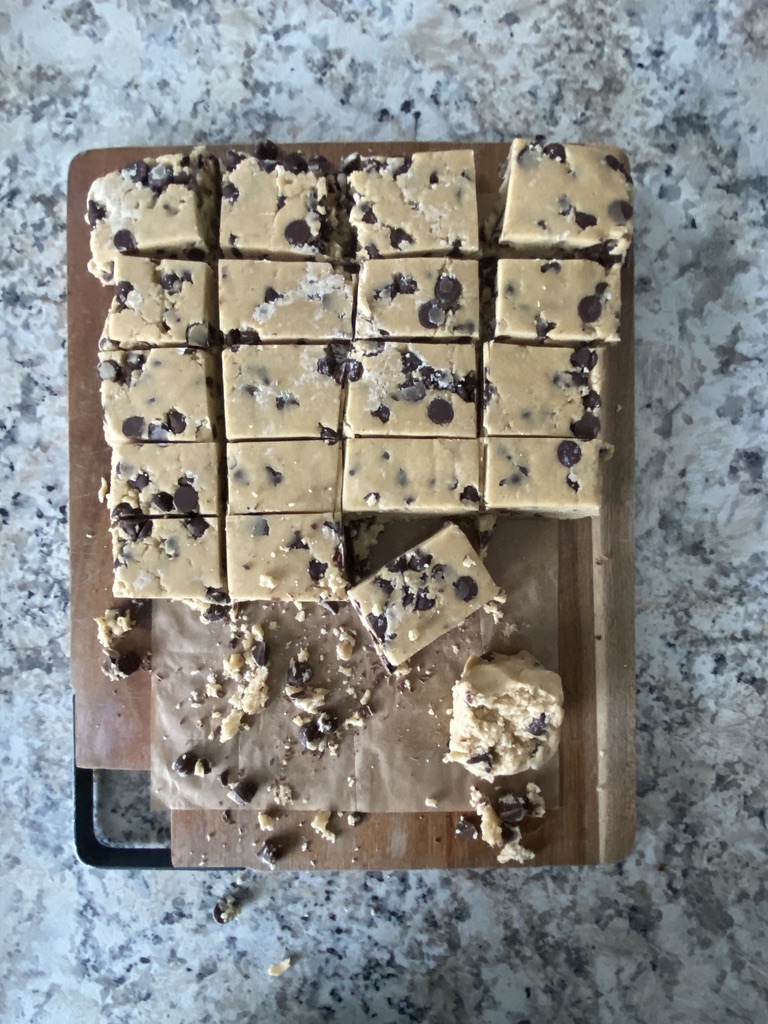Scooping out chilled dough can be difficult to do! My hand often gets very tired, but this little hack will be a game changer for your chilled dough. Simply press the dough into a parchment lined half sheet pan (or 13″x9″ dish), cover, and place into fridge to chill. When it is time to bake up the dough, remove from the pan and cut into desired sized cookies. I like to then roll them into balls and bake, but you can leave them in squares if you wish.